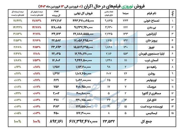 بر اساس این گزارش، اکران فیلم سینمایی «تمساح خونی» از ۱۶ اسفند ۱۴۰۲ آغاز شد و تا ۱۳ فروردین به فروش ۶۵ میلیارد و ۹۰۶ میلیون تومان رسید. همچنین اکران فیلمهای سینمایی «بیبدن»، «آپاراتچی»، «نوروز» و «آسمان غرب» از ۲۳ اسفند ۱۴۰۲ آغاز شد که از این تاریخ تا ۱۳ فروردین «بیبدن» به فروش بیش از ۱۰ میلیارد و ۴۸۵ میلیون تومان، «آپاراتچی» به فروش بیش از ۲ میلیارد و ۶۵۳ میلیون تومان، «نوروز» به فروش بیش از یک میلیارد و ۸۲۶ میلیون تومان و «آسمان غرب» به فروش بیش از ۹۵۷ میلیون تومان رسیدند.