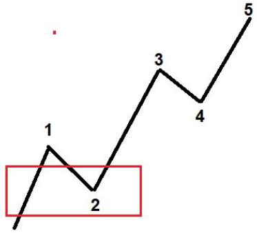 در تصویر زیر، نمونه صحیح یک حرکت پنج موجی نمایش داده شده است که در آن قانون اول رعایت شده است و موج دوم کوچکتر از موج اول است.