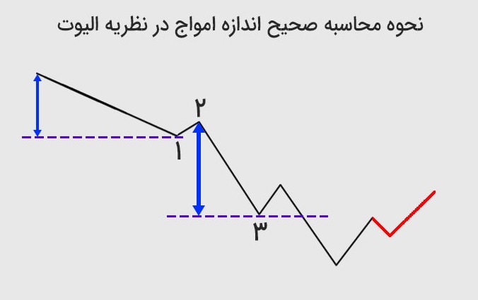 منظور از اندازه امواج الیوت، اختلاف قیمت انتهای یک موج، با انتهای موج قبلی آن است؛ نه طول موجها. طول خطوط اصلی در نمودارهای خطی و کندل استیک برای ما اهمیت ندارد؛ زیرا آنها فقط تعداد روز را نشان میدهند و هنگام استفاده از این نمودارها، باید ارتفاع خطوط را محاسبه کنیم.