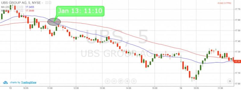 ین نمودار ۱۵ دقیقه ای UBS است.در ساعت ۱۲:۴۵ میانگین متحرک ۲۰ روزه میانگین ۵۰ روزه را به سمت پایین می شکند که ما در این نقطه پوزیشن فروش خود را باز می کنیم. توجه کنید که قیمت پس از عبور از میانگین متحرک ۲۰ روزه در نمودار ۱۵ دقیقه شروع به کاهش می کند.ما زمانی از معامله خارج می شویم که قیمت میانگین ۲۰ روزه را به سمت بالا قطع می کند.